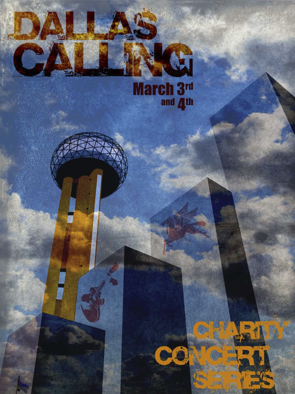 This is a poster I created in AdobeĀ® Photoshop for an imaginary charity concert series in Dallas. The Dallas skyline, including the Reunion Tower, was created using the Photoshop pen tool, I’m glad that I discovered Illustrator soon after this.